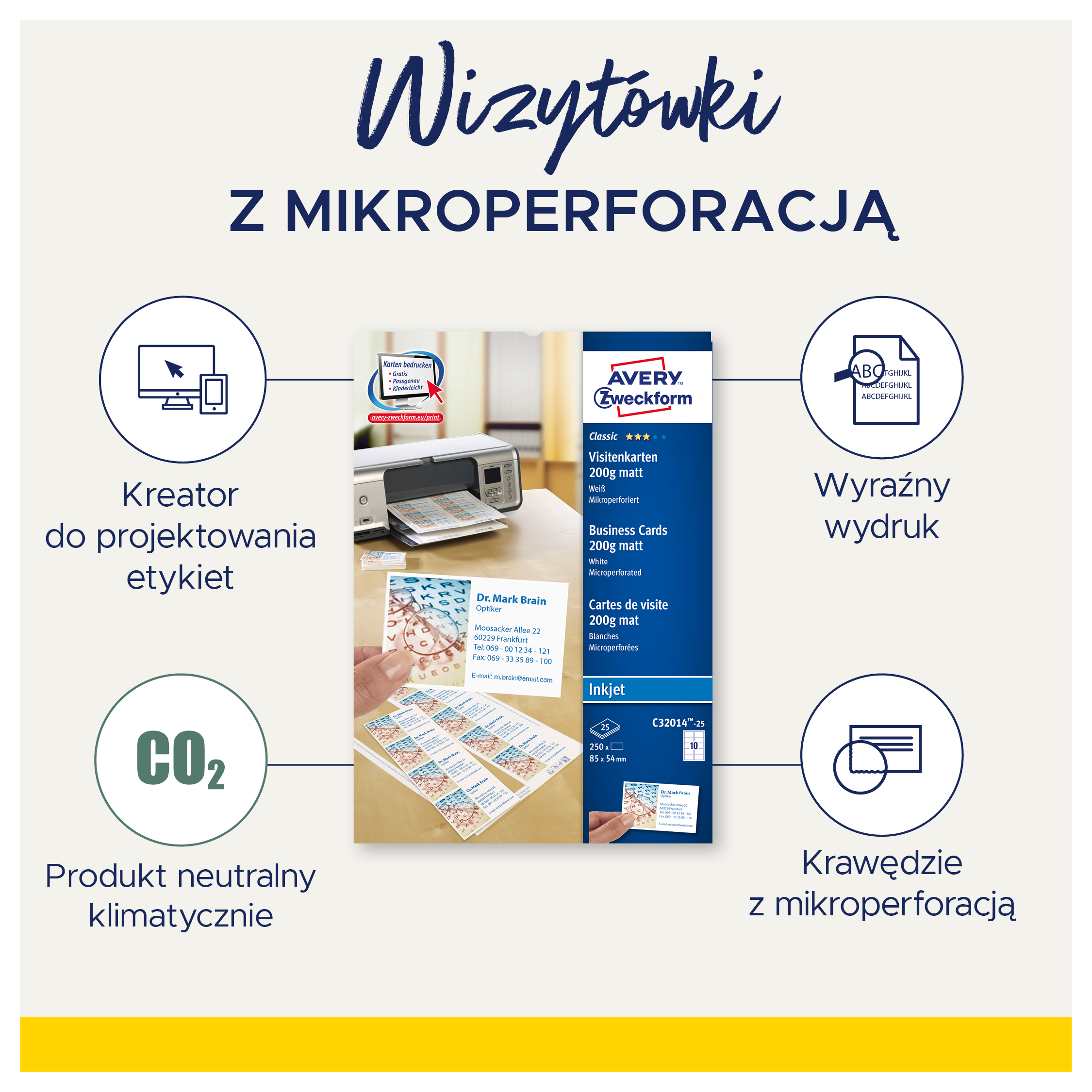 Wizytówki do druku z mikroperforacją Avery C32010-25 / 85 x 54 mm, 250 szt., 25 arkuszy, 185 g, matowe - biały