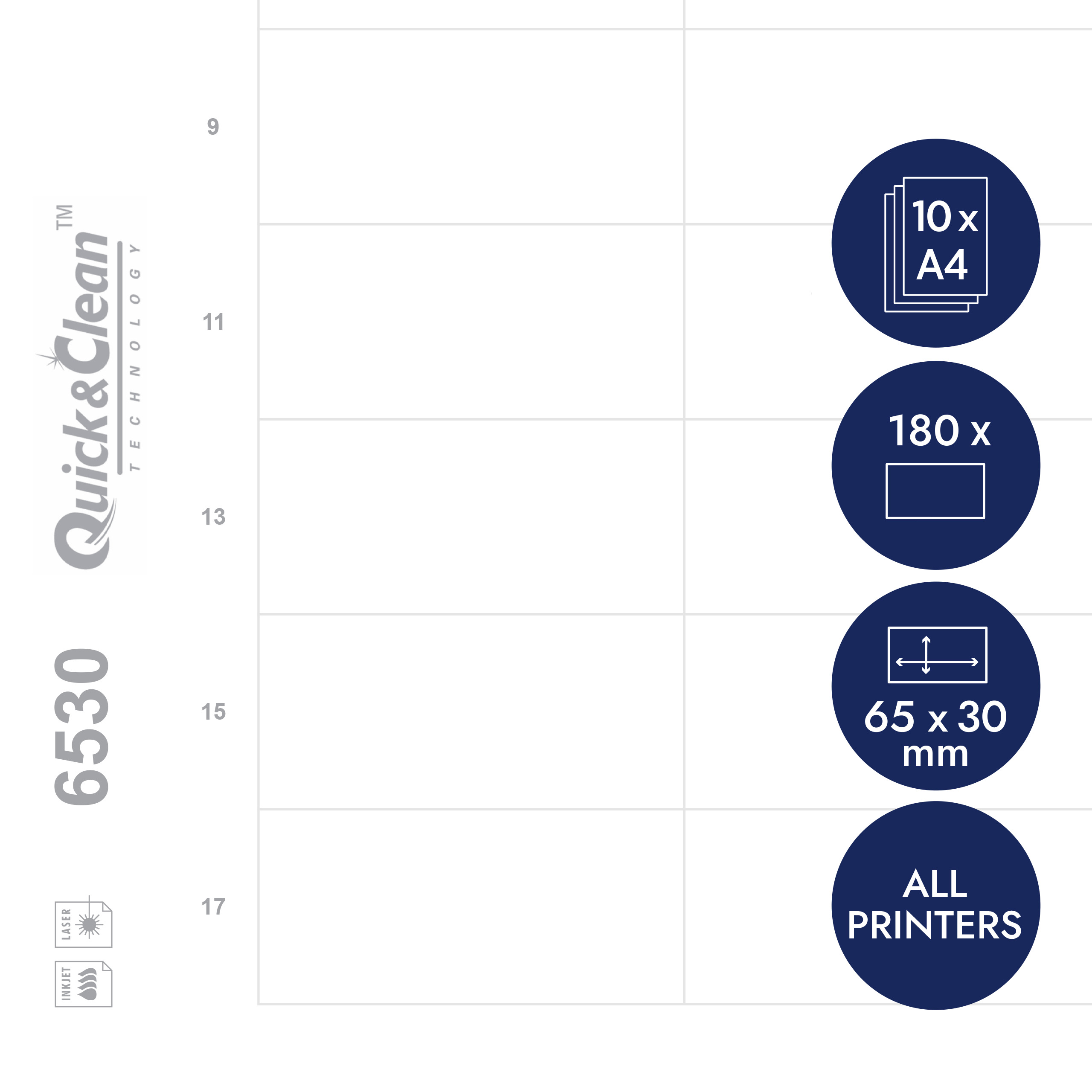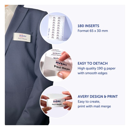 Wkłady do identyfikatorów Avery DPC6530A-10 / 65 x 30 mm, 10 arkuszy, 180 wkładów - biały